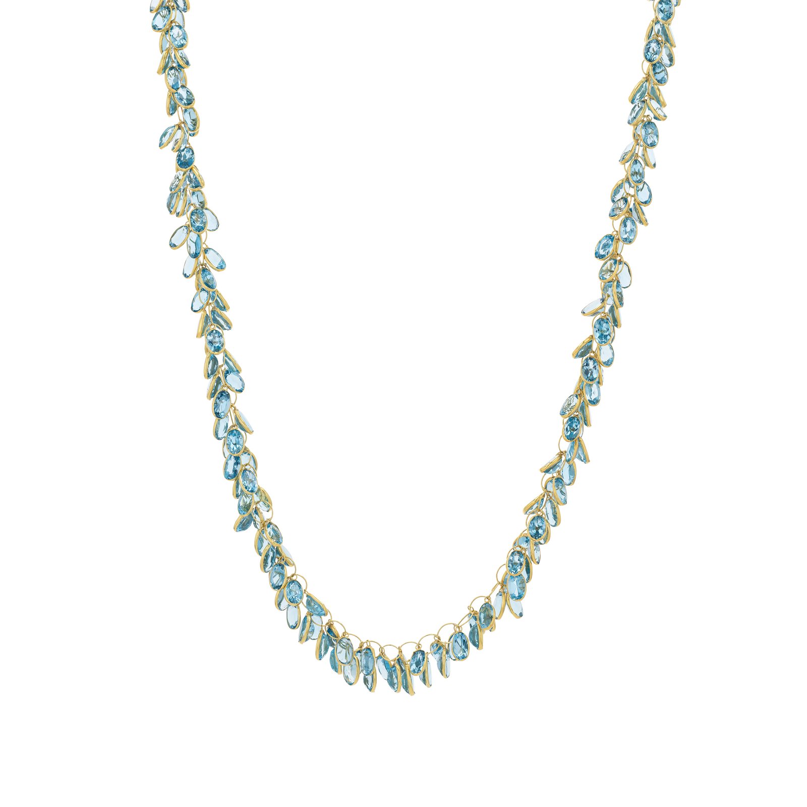 Exquisite 14K gold necklace featuring natural Blue Topaz gemstones totaling 64.50 carats, handcrafted with brilliance and clarity for a luxurious statement look.