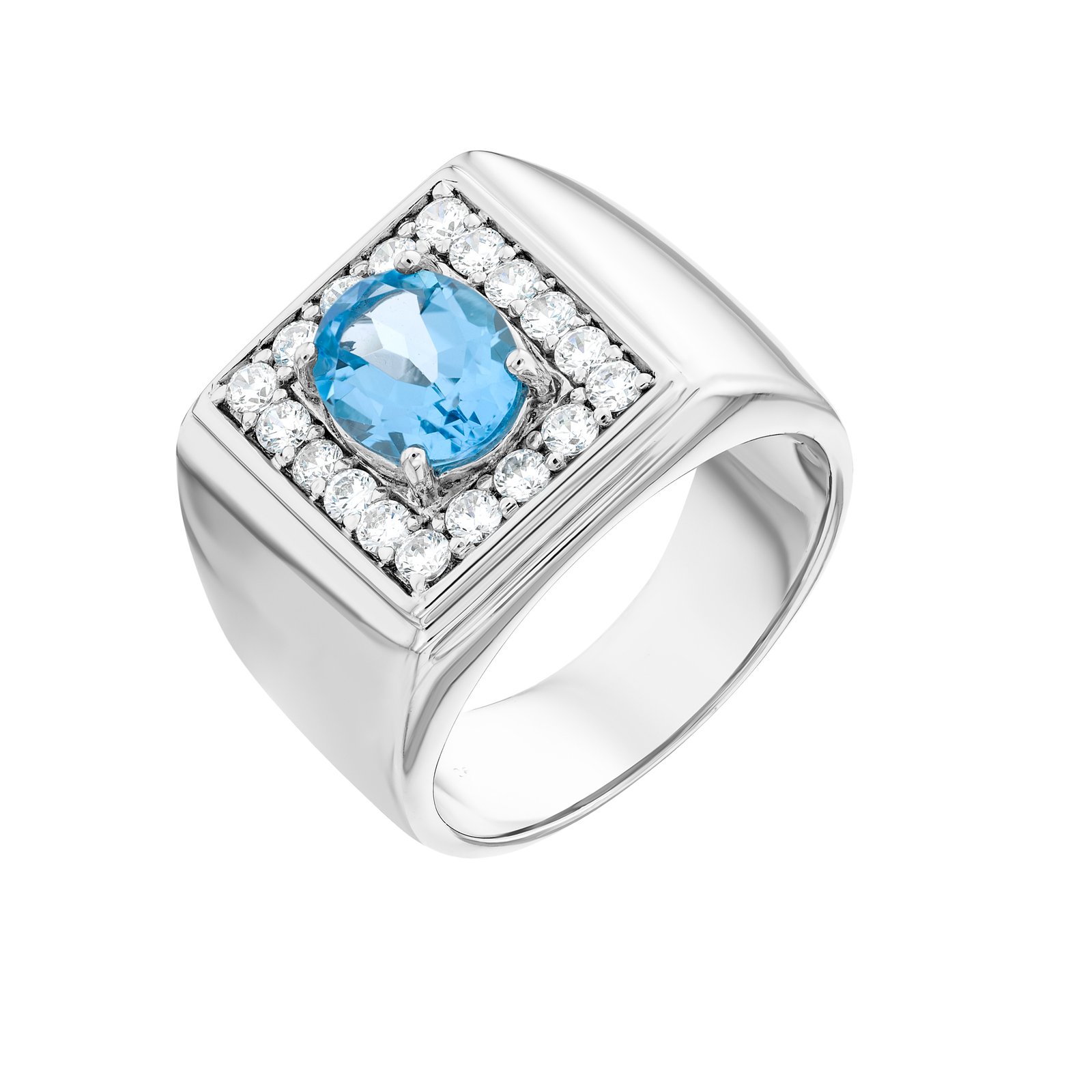 | Style | Luxurious men’s ring with Blue Topaz center and White Zircon accents |