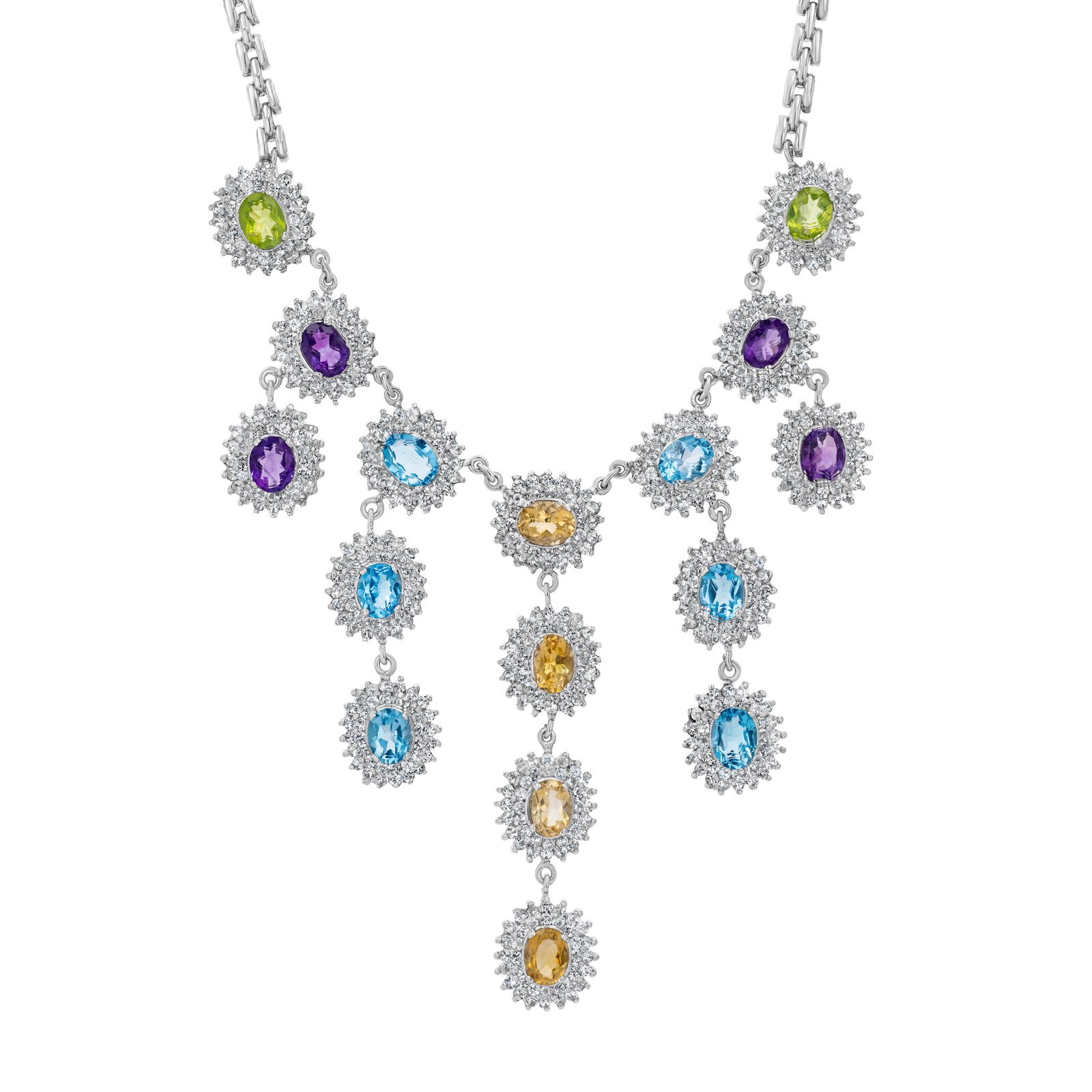 The gemstones weigh a total of 16.82 carats, shaped in oval with a mixed cut for maximum brilliance. The vibrant multicolor combination of amethyst, peridot, and blue topaz makes this piece perfect for any occasion.