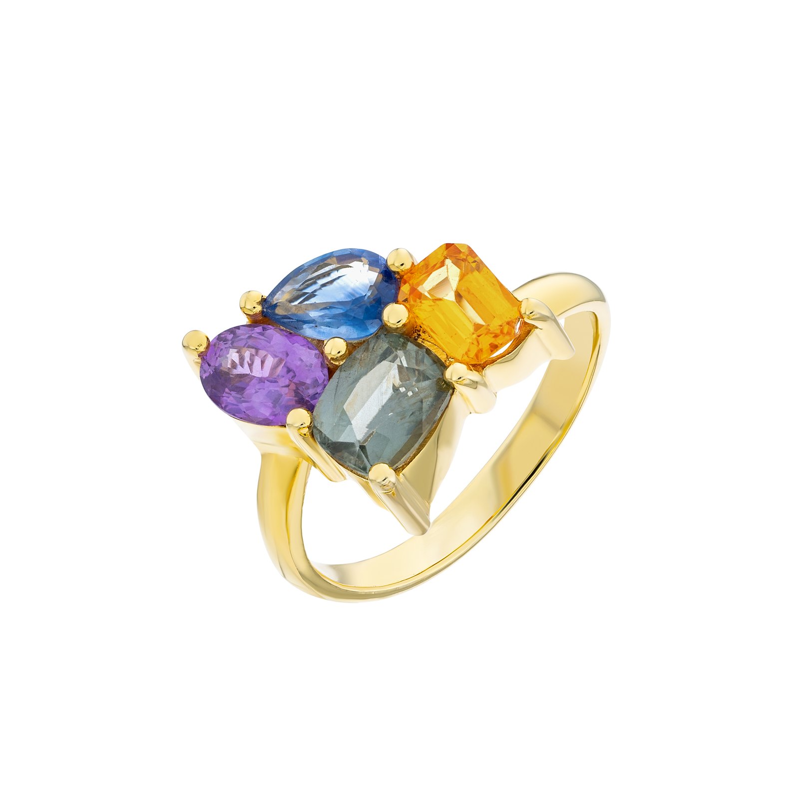 Made from 92.5% sterling silver and plated with gold, this ring features a stunning array of natural sapphires in vibrant hues — blue, pink, yellow, and green. Each gemstone is carefully set to reflect light beautifully, symbolizing harmony, balance, and joy.