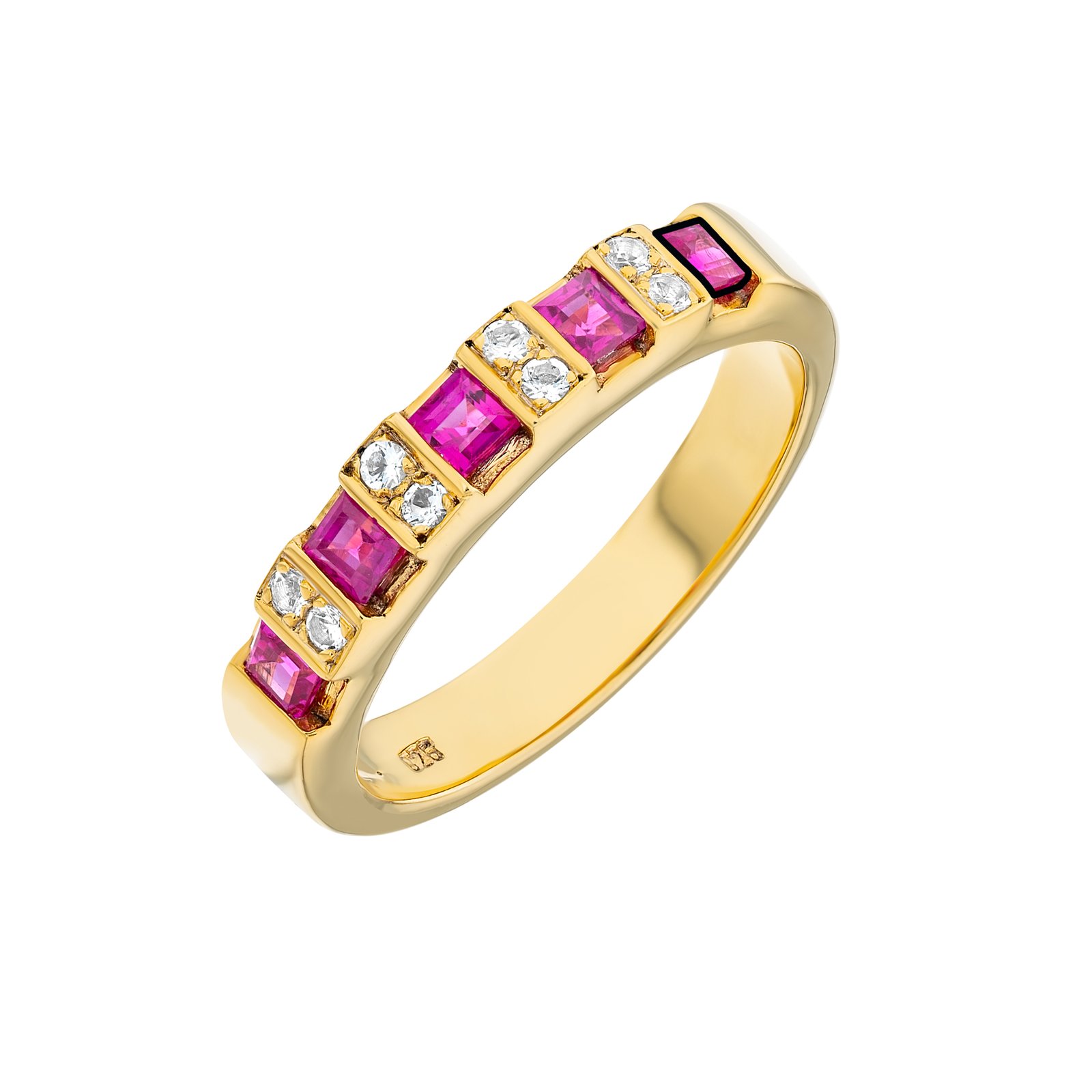 This Genuine Ruby & White Topaz Silver Ring captures classic luxury in every detail. Crafted from 925 sterling silver with an 18K gold-plated finish, the ring showcases alternating natural ruby and white topaz gemstones.