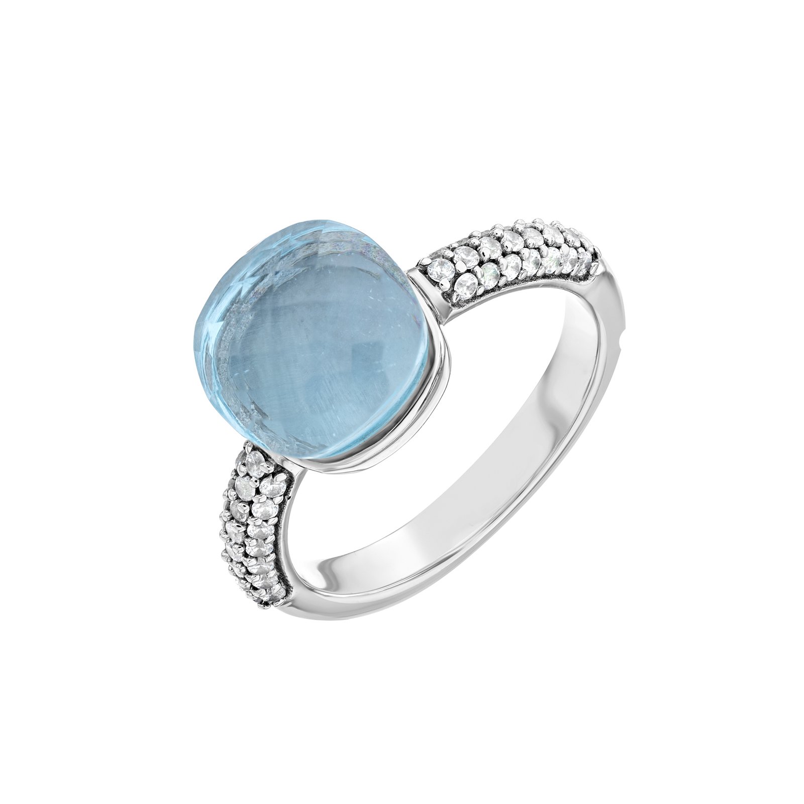Elegant 925 sterling silver ring with a natural Blue Topaz in oval cabochon cut, featuring a luminous sky-blue hue and rhodium-plated finish for lasting shine.